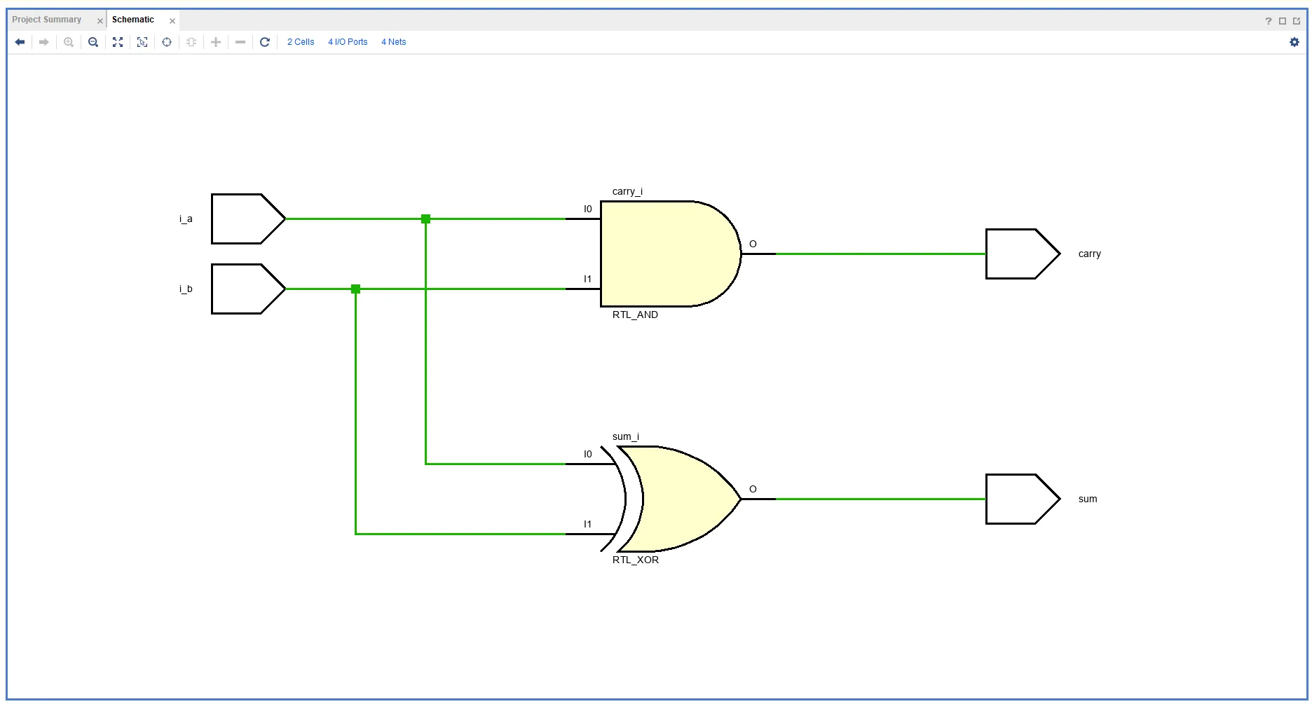 xor gate와 and gate를 이용해 sum과 carry를 출력한다.