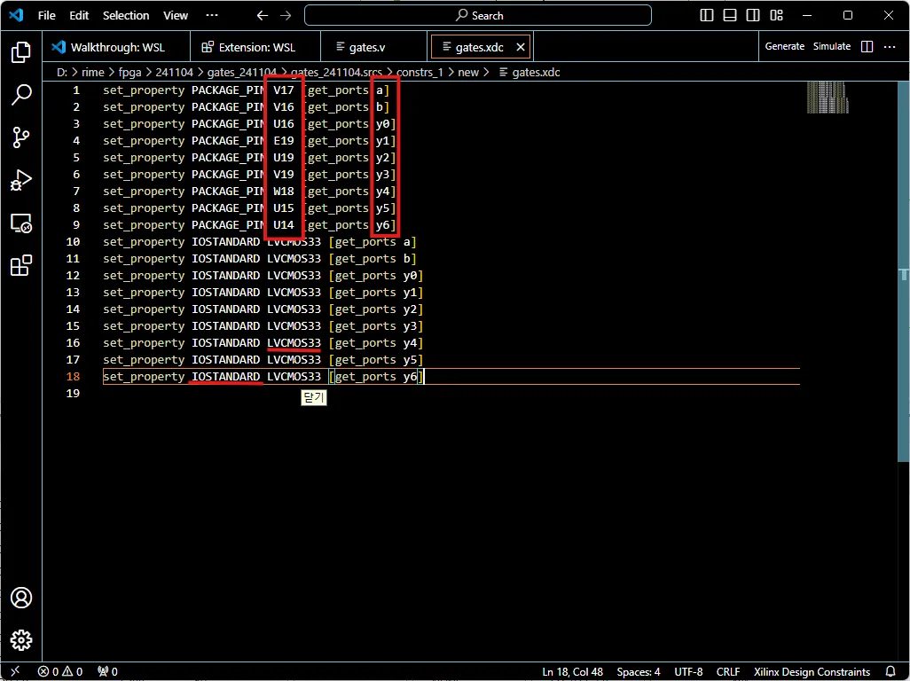 package pin, I/O std 설정 후 ctrl+s → xdc (constraint file) 생성